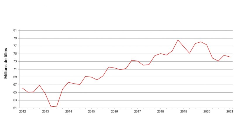 Au 1er décembre, il y avait 74,2 millions de porcs dans les élevages américains, soit une baisse de 4% par rapport à décembre 2020 et de 1% par rapport au 1er septembre 2021. Sur ces 74,2 millions de porcs, 68,0 millions étaient des porcs de marché, tandis que 6,18 millions étaient élevés pour la reproduction. Entre septembre et novembre 2021, 33,7 millions de porcs ont été sevrés dans les exploitations américaines, soit une baisse de 4% par rapport à la même période un an plus tôt.