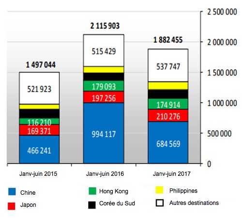 La Chine, principale destination, a connu une chute importante avec 684.569 t (-31% par rapport à janvier-juin 2016). Viennent ensuite : le Japon avec 210.276 t (+7%) ; Hong Kong avec 174.914 t (-2%) ; la Corée du Sud avec 146.553 t (+28%) ; les Philippines avec 128.396 t (+12%) et les Etats-Unis avec 78.488 t (+19%).