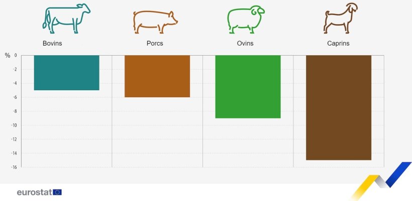 Au cours de la dernière décennie, les effectifs de toutes les espèces de bétail ont diminué. C'est le cheptel bovin de l'UE qui a le moins diminué, de 5 % par rapport à 2013, suivi par le cheptel porcin (- 6 %). Le nombre d'ovins a diminué de 9 %, tandis que celui des caprins a connu une forte baisse, de 15 %.
