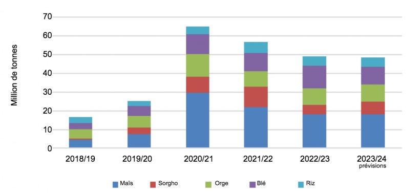 Cette année, la surface plantée en maïs devrait perdre du terrain au profit du soja, car les politiques et les subventions gouvernementales favoriseront la production de soja. Les importations de maïs pour la campagne de commercialisation 2023/24 devraient rester stables à 18 Mt, tandis que les importations de sorgho devraient revenir à des niveaux plus élevés en raison d'une offre internationale plus importante. La consommation et les importations de riz devraient diminuer, car moins de riz brisé sera importé et utilisé dans l'alimentation animale.