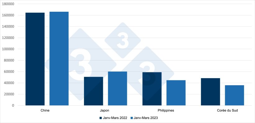 Les exportations vers la Chine, la principale destination, montrent une légère hausse de 1 % par rapport à la même période l'année dernière (166 264 t contre 164 549 t). Les exportations vers le Japon ont augmenté de 19 %, passant de 50 791 t à 60 195 t.) En revanche, les expéditions vers les Philippines et la Corée du Sud ont chuté de 24 % et 26 % respectivement.
