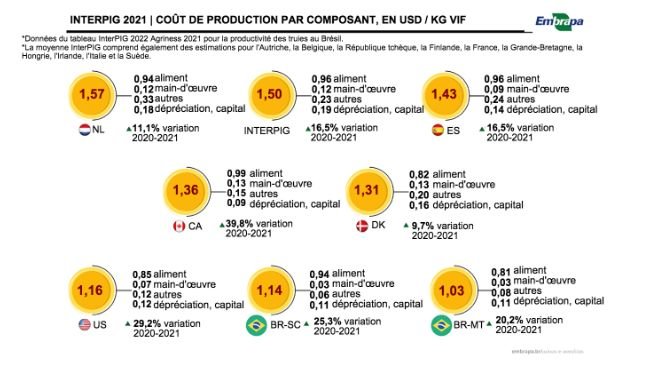 Les coûts de production des porcs dans le monde ont augmenté de manière significative en 2022, principalement en raison du prix du maïs et du tourteau de soja, sous l'effet d'événements climatiques et géopolitiques, tels que la guerre en Ukraine. Parmi les 17 pays représentés, le Brésil conserve le coût de production le plus bas en dollars par kilogramme de porc vivant. En 2022, le coût de production dans l'État brésilien du Mato Grosso était de 1,13 USD/kg vif, tandis qu'il était de 1,28 USD dans l'État de Santa Catarina. Les coûts du Brésil sont inférieurs à ceux des États-Unis (1,42 USD/kg vif), du Danemark (1,49 USD), de l'Espagne (1,66 USD), des Pays-Bas (1,74 USD) et de l'Allemagne (1,83 USD).