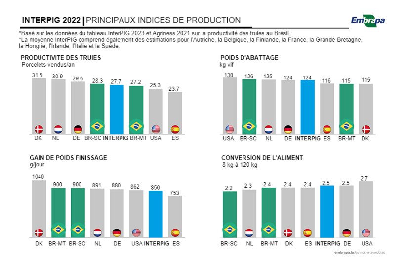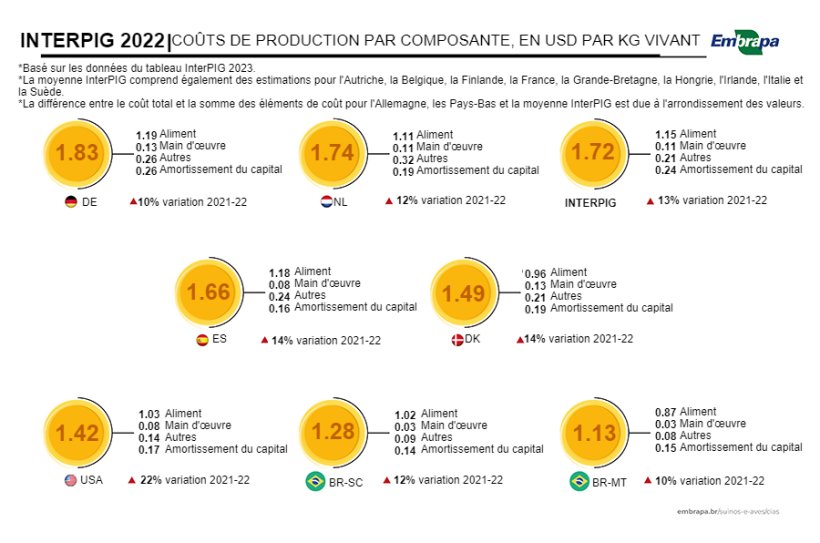 Les coûts de production des porcs dans le monde ont augmenté de manière significative en 2022, principalement en raison du prix du maïs et du tourteau de soja, sous l'effet d'événements climatiques et géopolitiques, tels que la guerre en Ukraine. Parmi les 17 pays représentés, le Brésil conserve le coût de production le plus bas en dollars par kilogramme de porc vivant. En 2022, le coût de production dans l'État brésilien du Mato Grosso était de 1,13 USD/kg vif, tandis qu'il était de 1,28 USD dans l'État de Santa Catarina. Les coûts du Brésil sont inférieurs à ceux des États-Unis (1,42 USD/kg vif), du Danemark (1,49 USD), de l'Espagne (1,66 USD), des Pays-Bas (1,74 USD) et de l'Allemagne (1,83 USD).