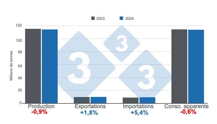 - La consommation apparente diminuerait de 0,6 %, passant de 114,5 Mt à 113,8 Mt.