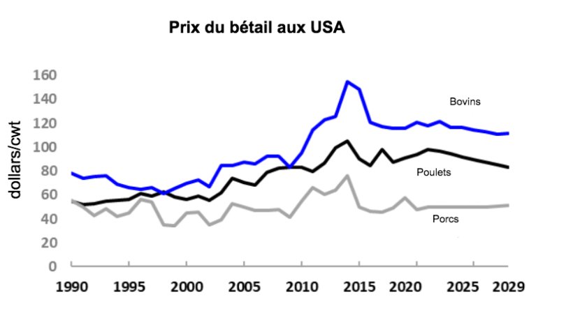 Bien que la production de viande de porc et de veau ait été plus ou moins équivalente ces dernières années, la production de viande de porc devrait dépasser la production de viande bovine durant la majeure partie de la période de projection, atteignant un maximum de 32,1 milliards de livres en 2029, contre 29,5 milliards de livres pour le bœuf.