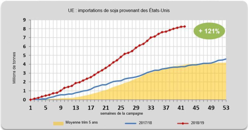 - par rapport aux 42 premières semaines de la campagne 2017/2018 (de juillet à mi-avril), les importations dans l'UE de graines de soja en provenance des États-Unis ont augmenté de 121 % au cours de la campagne actuelle, pour atteindre 8 244 594 tonnes;