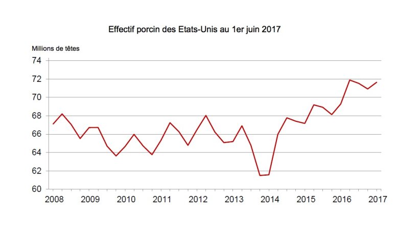 On devrait atteindre 3,06 millions de truies ayant mis bas durant le trimestre juin-août 2017, légèrement inférieur au nombre de truies ayant réellement mis bas sur la même période en 2016, et 2% depuis 2015.