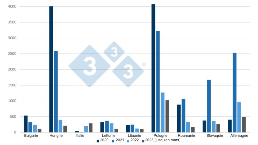 A noter également le cas de la Roumanie où, en 2022, le nombre de foyers chez les sangliers a diminué par rapport à 2021 (321 contre 1.671) mais où, au cours du premier trimestre 2023, 171 foyers ont déjà été déclarés. En ce qui concerne les foyers chez les porcs domestiques, 53 foyers ont été déclarés au cours de ce trimestre, ce qui en fait le pays de l'UE où le nombre de foyers déclarés est le plus élevé.