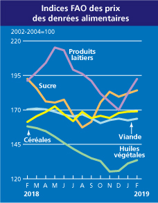 L’Indice FAO des prix des céréales s’est établi en moyenne à près de 169 points en février, en légère hausse par rapport à janvier et près de 8 points (4,7 pour cent) au-dessus de son niveau de février 2018. Parmi les principales céréales, les prix du maïs ont enregistré la plus forte hausse, sous l’effet d’une augmentation des prix à l’exportation aux États-Unis, qui s’explique principalement par des craintes de perturbations sur les expéditions. Toutefois, les prix du blé, qui s’étaient affermis au début du mois en raison d’inquiétudes concernant l’offre, ont été soumis à une importante pression à la baisse suite à un ralentissement des achats. L’indice FAO des prix du riz est resté stable, car la faiblesse de la demande a tiré les cours de l’Indica vers le bas, compensant les gains continus enregistrés sur le marché du Japonica, qui a bénéficié d’échanges plus soutenus.