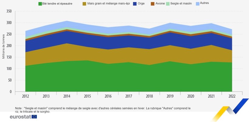 Production des principales céréales dans l'UE, 2012-2022. Source : Eurostat