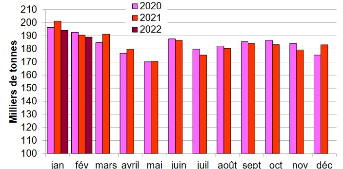 Selon France AgriMer, quasi stables sur l’année 2021 comparée à l’année 2020 (+ 0,1 %), les abattages en France sont, en janvier et février 2022, en léger recul par rapport aux années antérieures (- 2,2 % en volume par rapport à 2021), et reflètent le tassement du cheptel français.