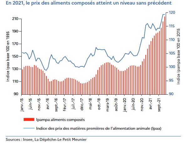 En 2021, le prix d’achat des aliments pour animaux augmente de 11,2 % en moyenne sur un an. La hausse touche aussi bien les matières premières pour animaux (+ 12,0 %) que les aliments composés (+ 10,9 %). La hausse atteint 17,4% pour les aliments céréales et sous-produits, 16,4 % pour les tourteaux et 6,3 % pour les autres matières premières comme la luzerne déshydratée ou la pulpe de betterave. Le prix des aliments s’accroît dans le sillage de l’envolée du prix des matières premières utilisées pour nourrir les animaux : + 22,1 % pour le blé, + 38,8 % pour le maïs, +34,2 % pour l’orge +16,2 % pour le tourteau de soja et +22,6 % pour le tourteau de colza en moyenne sur l’année. Le prix des matières premières entrant dans l’alimentation animale (Ipaa) augmente ainsi de 25,8 % en moyenne sur un an.
