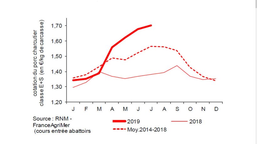 Depuis le printemps 2019, les cours sont en hausse particulièrement marquée, contrairement à la situation de 2018. Dans les pays du sud de l’Europe, le repli habituel saisonnier de l’offre porcine et la demande touristique soutiennent les cours. En France, le gain est de 6 cts d’euros/kg en juin et de 2 cts d’euros/kg en juillet.