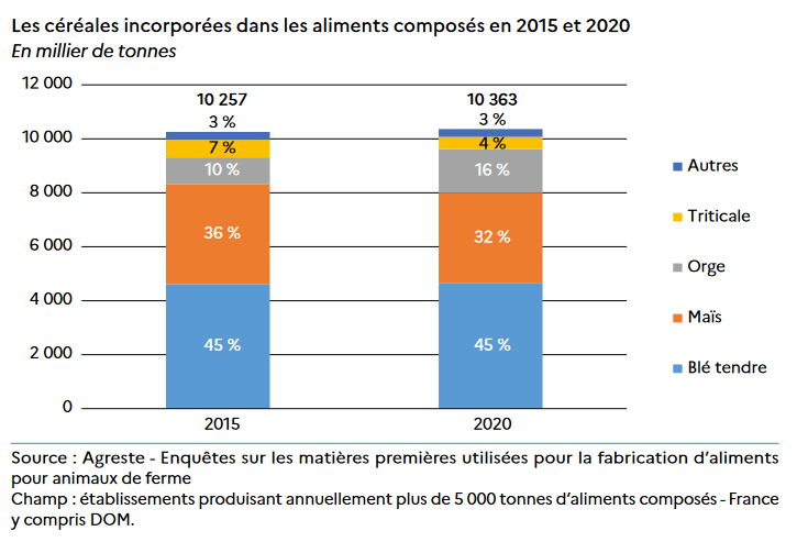 En 2020, 21 millions de tonnes d’aliments composés pour animaux de ferme ont été produits par l’industrie, soit une baisse de 2,5 % par rapport à 2015. Parmi les matières premières utilisées, la moitié sont des céréales dont le volume et la part augmentent légèrement, en particulier pour l’orge. Parmi les tourteaux, l’utilisation de tourteaux de soja recule fortement (- 17 %). La baisse est moins marquée pour les coproduits de transformation. Dans un contexte de crise du porc, le volume d’aliments fabriqués pour cette filière poursuit son repli.