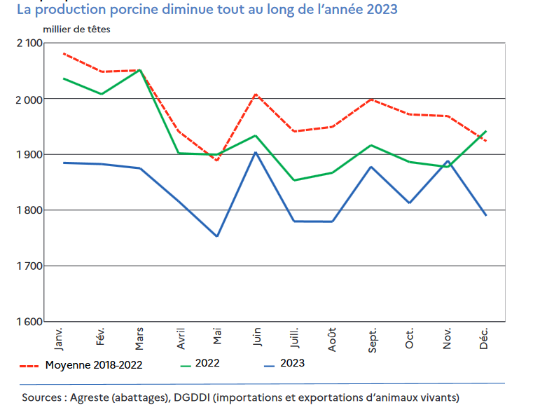 Sur le plan des échanges, les exportations de viande porcine ont reculé pour la deuxième année consécutive avec une baisse de 7,5 % en volume en 2023, particulièrement vers la Chine où la production locale s'est rétablie après la crise de la peste porcine africaine. Les importations de viande porcine, bien qu’en baisse de 5,8 %, sont restées essentielles pour combler le besoin intérieur, avec des contributions majeures en provenance d’Espagne et d’Italie. La balance commerciale a enregistré un déficit croissant, passant de -0,365 milliard d’euros en 2022 à -0,551 milliard d’euros en 2023.