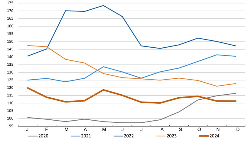 En 2024, l’indice FAO des prix des céréales s’est élevé à 113,5 points en moyenne, soit une diminution de 17,4 points (13,3 pour cent) par rapport au niveau de 2023, ce qui s’explique par un tassement des prix du blé et des céréales secondaires et marque la deuxième année consécutive de baisse par rapport aux niveaux sans précédent de 2022. L’indice FAO des prix de tous les types de riz a atteint en moyenne 133,1 points, une hausse de 0,8 pour cent par rapport à 2023 et son cours nominal le plus élevé des 16 dernières années. Cette progression annuelle repose sur les cours du riz Indica, étant donné que la forte demande à l’importation de certains pays en Asie et l’affaiblissement de la concurrence entre exportateurs les ont maintenus à un niveau élevé au cours des neuf premiers mois de 2024.