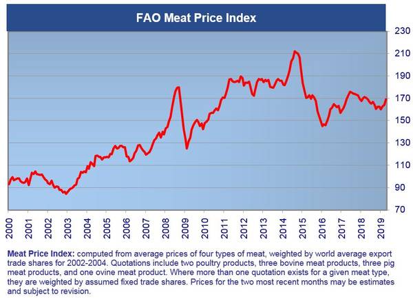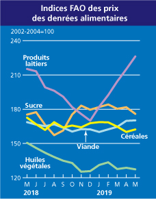 L'Indice FAO des prix des produits alimentaires, qui suit l'évolution mensuelle des échanges commerciaux pour les principaux groupes de produits alimentaires, affichait une moyenne de 172,4 points en mai, soit en hausse d'1,2 pour cent par rapport au mois dernier mais en baisse d'1,9 pour cent par rapport au niveau enregistré en mai 2018.