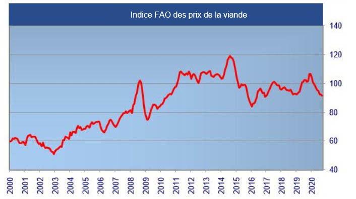 L’Indice FAO des prix de la viande s’est établi en moyenne à 91,6 points en septembre, en léger recul (0,9 pour cent) par rapport au mois d’août. La tendance générale à la baisse constatée depuis le mois de janvier de cette année se poursuit. En glissement annuel, l’Indice recule de 9,5 points (9,4 pour cent) par rapport à sa valeur à la même période l’année dernière. En septembre, les cours de la viande de porc ont baissé, en partie du fait de la décision de la Chine d’interdire les importations en provenance d’Allemagne, où des cas de peste porcine africaine ont été détectés chez des sangliers. Les cours de la viande d’ovins ont quant à eux diminué en raison de disponibilités saisonnières importantes en Australie. En revanche, les cours de la viande de volaille ont progressé, sous l’effet du rythme élevé des ventes internationales et de disponibilités exportables limitées au Brésil. Les prix de la viande de bovins sont restés stables, car la hausse des cours des produits brésiliens a été presque compensée par le recul de ceux des produits australiens, recul qui est principalement imputable aux conditions sous-jacentes de la demande à l’importation auxquelles sont confrontés tous les marchés.