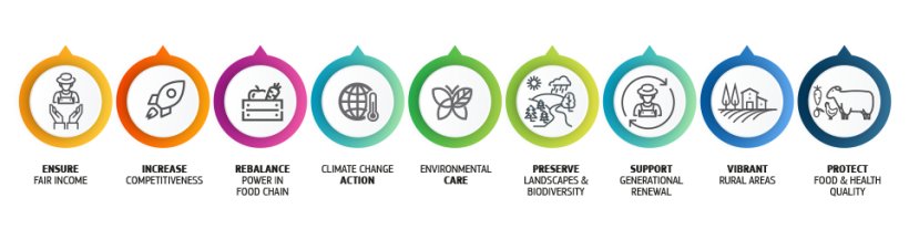 Les neuf objectifs de la future PAC sont : assurer un revenu équitable aux agriculteurs, accroître la compétitivité, rééquilibrer les pouvoirs dans la chaîne d'approvisionnement alimentaire, agir contre le changement climatique, protéger l’environnement, préserver les paysages et la biodiversité, soutenir le renouvellement des générations, dynamiser les zones rurales, garantir la qualité des denrées alimentaires et la santé.