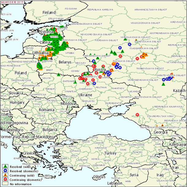 Fig. 1 Foyers de peste porcine africaine confirmés par l'OIE depuis janvier 2015.