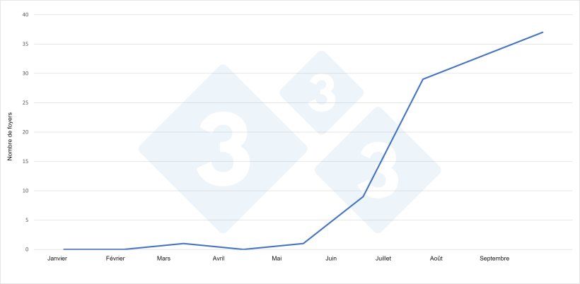 Au cours des cinq premiers mois de 2021, seuls deux foyers ont été signalés. Avec l'arrivée de la saison estivale, le nombre de foyers a commencé à augmenter fortement, la plupart des foyers se produisant en septembre (37 foyers), un peu moins en août (33 foyers) et en juillet (29 foyers). Cette tendance alarmante a changé en octobre, avec seulement 2 foyers de PPA détectés jusqu'à présent dans le mois, au 18 octobre.