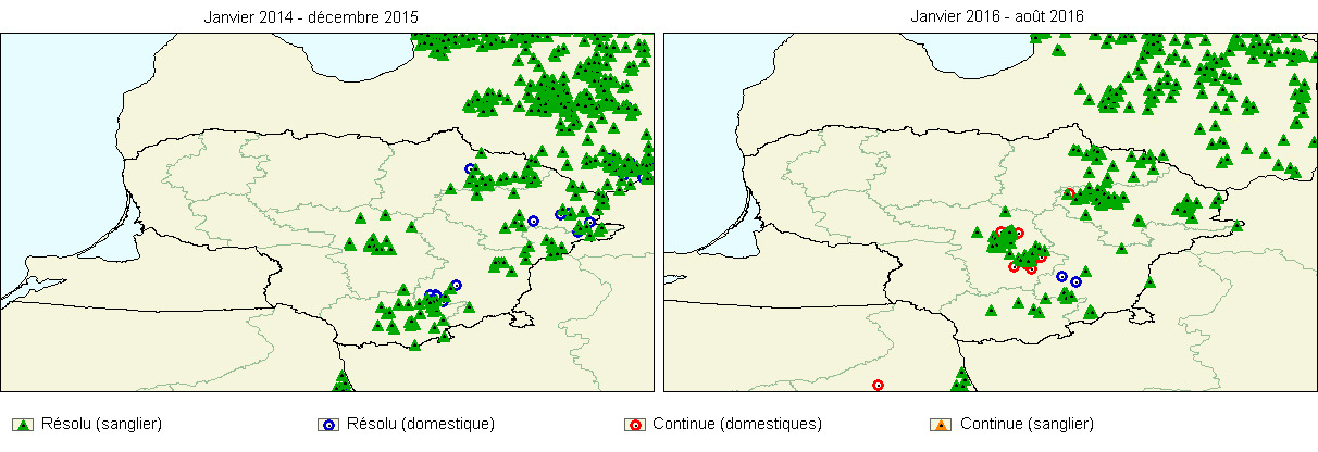 Outre ces cas chez des porcs domestiques, la maladie continue à circuler au sein de la population de sangliers. Jusqu'à présent, en 2016 ont été signalés 30 foyers, se situant tous dans la province de Podlaskie, près de la frontière avec la Biélorussie.