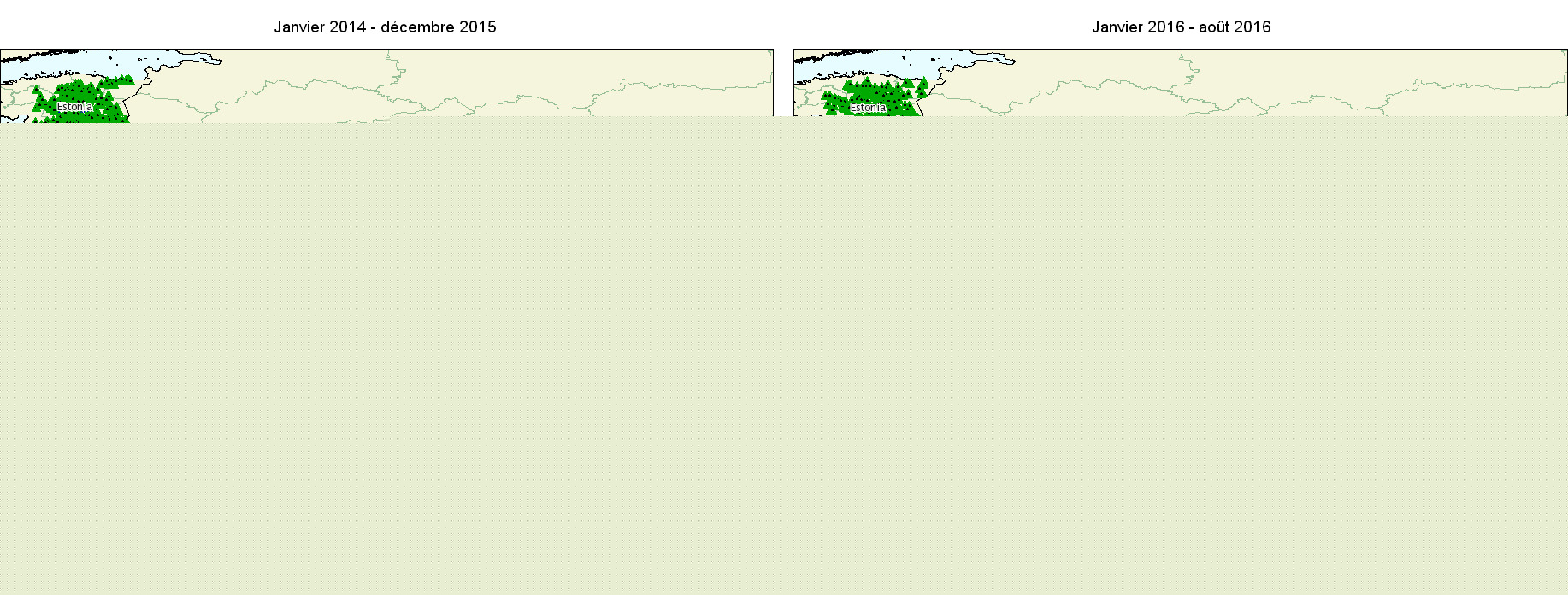 Les cas de peste porcine africaine (PPA) ont augmenté de façon significative dernièrement en Pologne, Ukraine et Russie. En Estonie a aussi été signalé récemment un cas dans une explotation située en dehors des zones de restriction définies par l'UE. La portée de l'évolution de la maladie dans ces pays, ainsi que dans les républiques baltes, se voit clairement au travers des cartes comparant les foyers signalés à l'OIE en 2016 par rapport aux deux années précédentes.