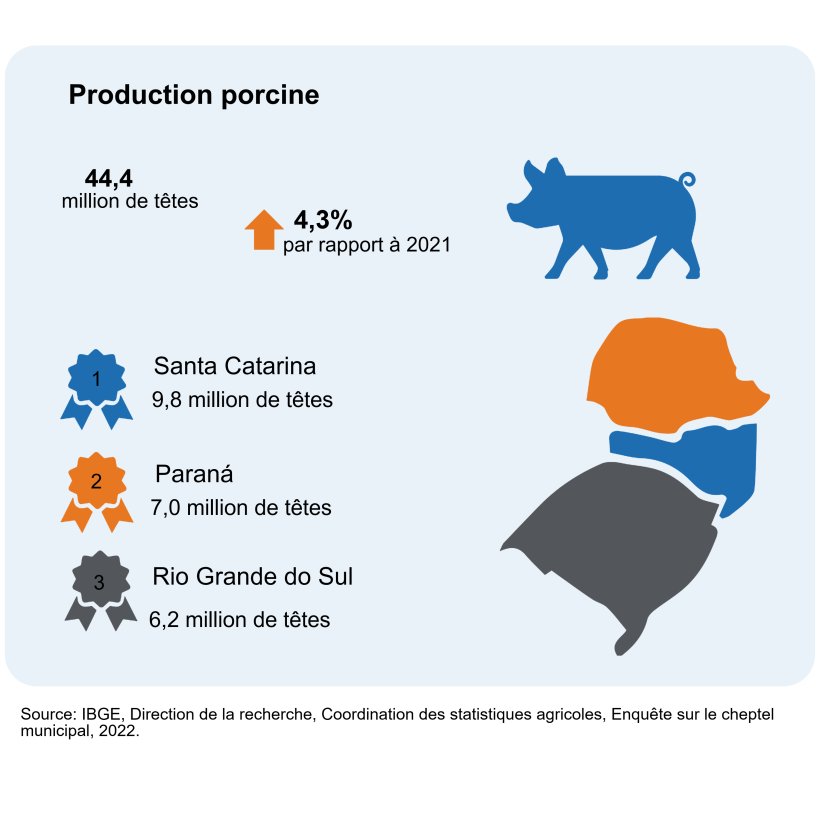 Malgré les difficultés rencontrées par la filière, notamment avec des coûts de production élevés, la croissance du nombre de truies et de porcs, ainsi que de l'abattage de porcs (un record en 2022), a continué d'être tirée par les exportations de viande de porc, qui ont atteint le deuxième rang résultat de la série en 2022. La Chine reste la principale destination, mais avec une part plus faible du volume total exporté, selon les données de Secex. La consommation intérieure a également continué de croître (7,8%), atteignant 18 kilos par habitant.