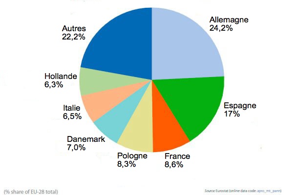 La production de viande de porc de l'UE-28, soutenue par l'augmentation des exportations vers la Chine et par les prix bas des aliments, a augmenté de 3,7% entre 2014 et 2015, atteignant 22,9 millions de tonnes. Presque tous les Etats membres de l'UE, à l'exception du Danemark, de l'Autriche et de la Belgique, ont poursuivi une hausse de la production ou tout du moins ont freiné la diminution de la production porcine (par exemple l'Allemagne) en 2015. L'Allemagne a produit environ 1/4 (24,2% ou 5,6 millions de tonnes) de la viande de porc de l'UE-28 en 2015, tandis que l'Espagne a produit 1/6 (17,0% ou 3,9 millions de tonnes) du total de l'UE-28, qui a été de 23 millions de tonnes.