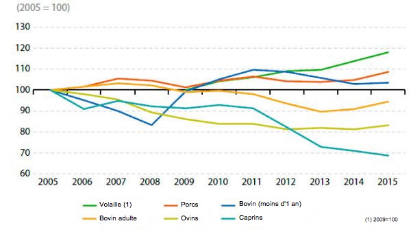 En 2015, malgré les aides au stockage privé pour la viande de porc, le prix a continué en baisse constante. En 2015, l'indice des prix de la viande de porc a diminué de 11,6% par rapport à 2014. Sur la période 2010-15, l'indice a baissé de 5,1%. Le prix moyen des porcs a été de 110 euros par 100 kg.