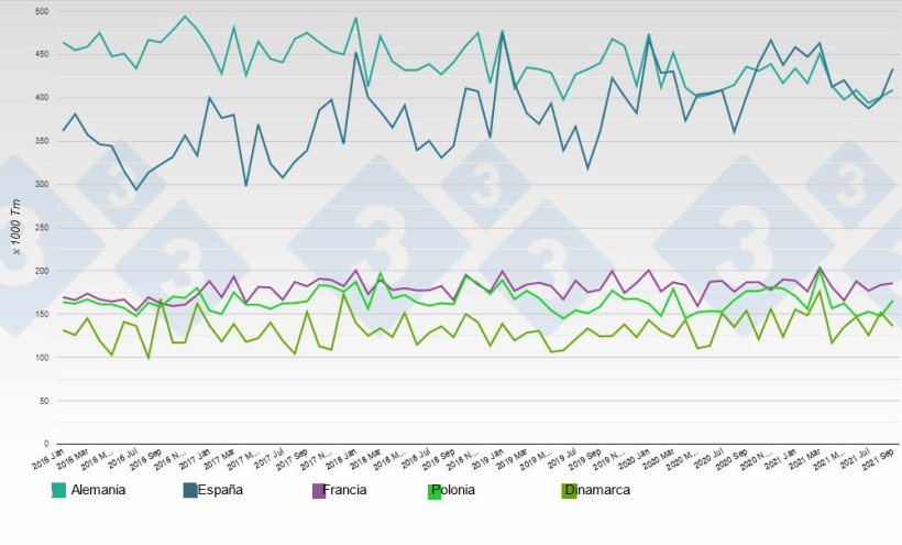 Selon les données d'Eurostat, la production de viande porcine en Espagne entre janvier et septembre de l'année dernière s'est élevée à 3.823.670 tonnes, soit une hausse de 3,89% par rapport à la même période de l'année précédente (Fig. 1). En ce qui concerne le nombre de têtes abattues, l'augmentation est de 4,30%, passant de 41.140.634 têtes entre janvier et septembre 2020 à 42.907.752 têtes pour la même période en 2021.