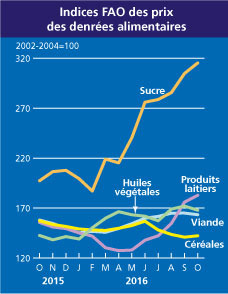 L'Indice des prix des produits alimentaires, en hausse constante depuis le début de l'année 2016, à l'exception du mois de juillet, est un indice pondéré par les échanges commerciaux qui permet de suivre l'évolution des prix des cinq principaux groupes de produits alimentaires sur les marchés internationaux.