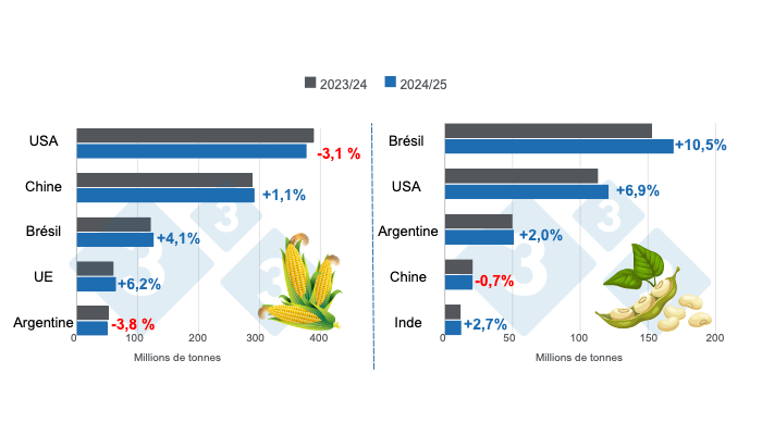 - Pour les États-Unis, la production atteindrait 377,5 millions de tonnes (Mt), soit une baisse de 3,1 % par rapport à la saison précédente (389,7 Mt), tandis que la Chine verrait sa récolte augmenter de 1,1 %, atteignant 292,0 Mt. Pour sa part, celle de l'Union européenne augmenterait de 6,2 %, s'établissant à 64,8 Mt, tandis que celle de l'Ukraine, avec 27,7 Mt, diminuerait de 10,6 % par rapport aux 31 Mt consolidées au cours du cycle précédent.