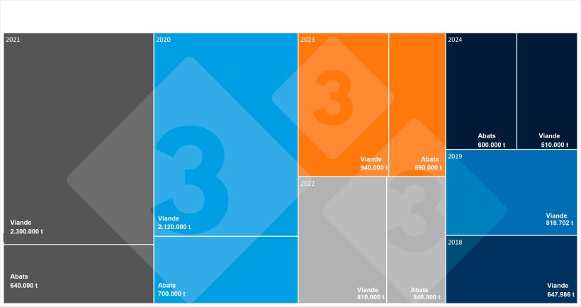 Malgré ces mauvais chiffres, les baisses mensuelles des importations de viande et d'abats au cours du deuxième trimestre ont été moins sévères (avec une baisse moyenne de -20,23 % au deuxième trimestre 2024 par rapport à la même période en 2023) que celles enregistrées au premier trimestre (-36,67 %).
