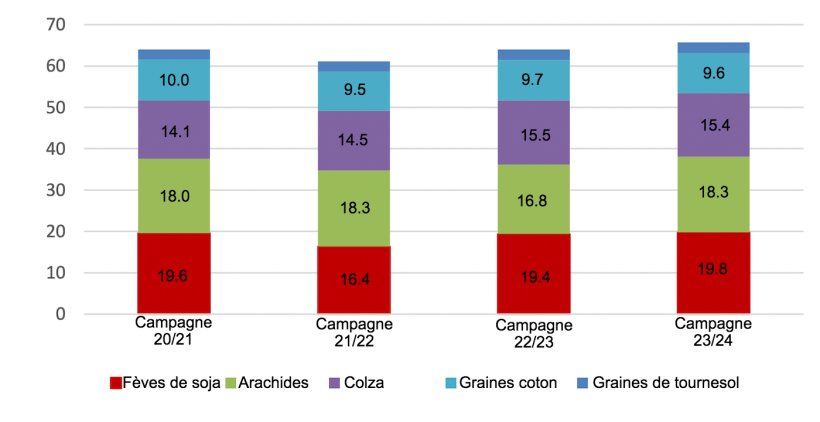 Le volume de soja concassé devrait s'élever à 95 millions de tonnes au cours de la campagne 23/24, contre une estimation de 94 millions de tonnes au cours de la campagne 22/23. L'utilisation totale de tourteaux protéiques pour l'alimentation animale devrait augmenter de 1,4 % au cours de l'exercice 23/24, en glissement annuel, pour atteindre 98,1 Mt.