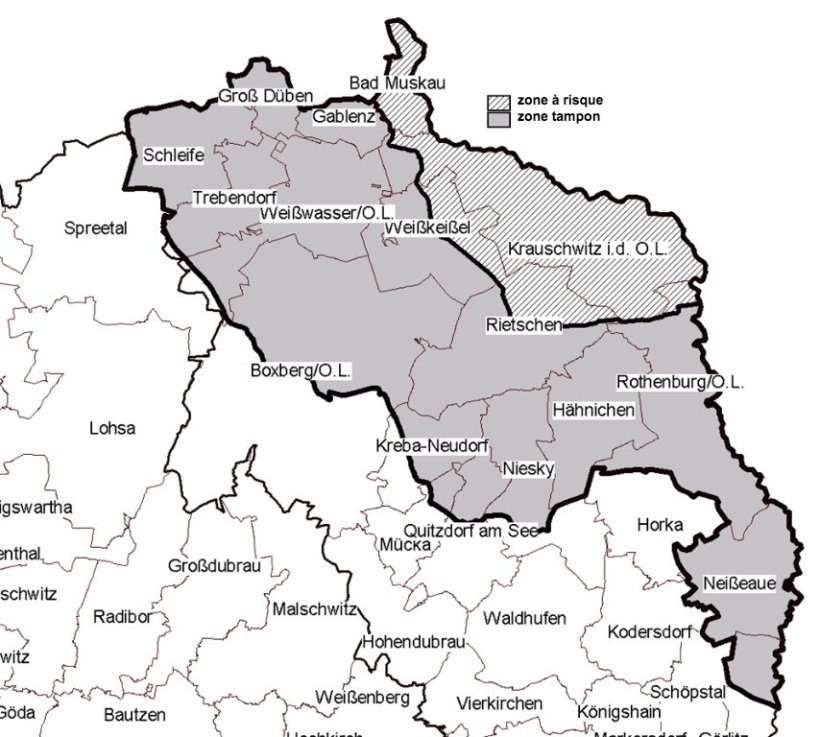 La zone tampon entourant la zone à risque est élargie. Elle est immédiatement adjacente à la zone à risque et a une largeur d'au moins 6 km. Sur le plan spatial, la zone tampon longe la Neiße depuis l'autoroute A4 près de Görlitz jusqu'à la frontière du Brandebourg au nord.