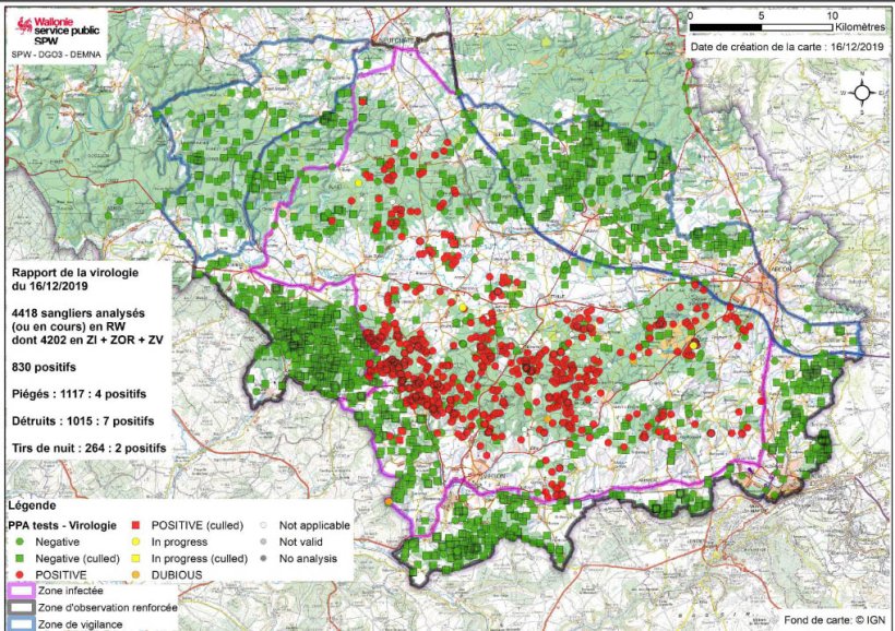 Selon les données du gouvernement de Wallonie, au 16/12/2019, 830 sangliers se sont révélés positifs au virus de la peste porcine africaine (PPA) parmi 4418 analysés.