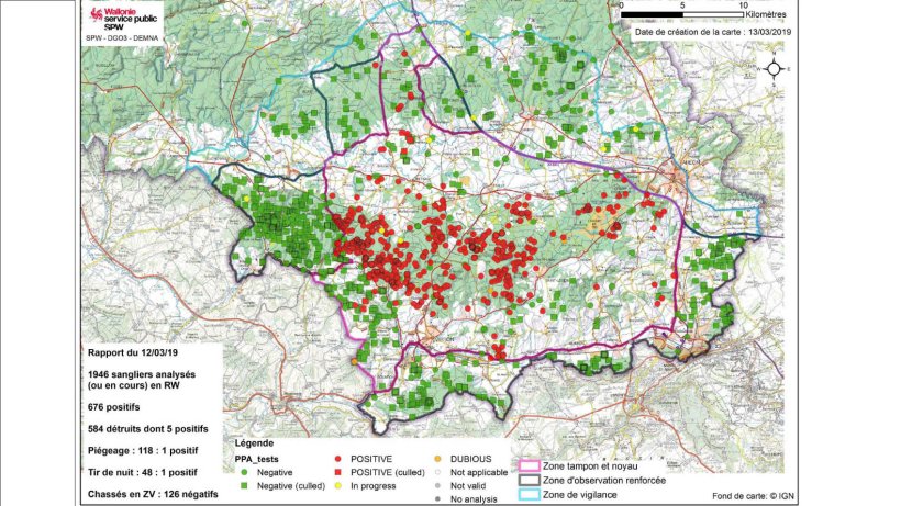 En date du 12 mars 2019, 1946 sangliers ont été analysés (ou sont en cours d'analyse). Parmi ceux-ci, 676 carcasses se sont révélées viropositives.