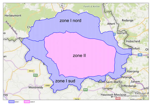 La zone I est une zone tampon qui entoure la zone II et qui comprend une partie de l’ancienne zone infectée (= zone I sud) ainsi qu’une nouvelle zone au nord de la zone infectée (= zone I nord).