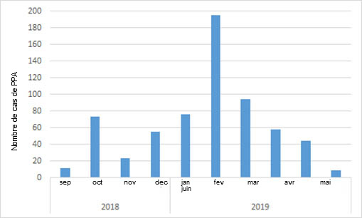 La figure montre une réduction du nombre de sangliers positifs retrouvés morts ou abattus par les autorités sanitaires depuis février 2019. Il convient toutefois de rester prudent concernant cette diminution. Il faudrait pouvoir l’interpréter au regard d’autres éléments non disponibles : nombre de sangliers découverts/abattus mensuellement, taille de la population sensible restante, etc.