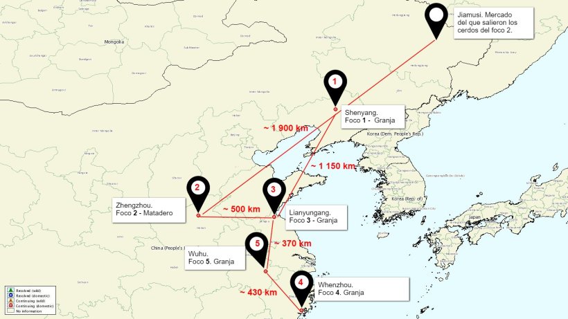 Les foyers sont situés dans deux fermes des provinces du Zhejiang et de l’Anhui, au sud par rapport aux autres foyers et à une grande distance l'une de l'autre. La première exploitation est à Whenzou avec 1.864 animaux sensibles et 430 cas, et l'autre est à Wuhu et compte 459 animaux sensibles, dont 185 cas.