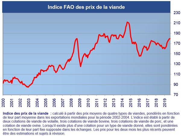 L’Indice FAO des prix de la viande* s’est établi en moyenne à 179,8 points en août, en hausse de 0,5 pour cent (près de 1 point) par rapport à sa valeur révisée de juillet, ce qui prolonge la tendance à la hausse modérée des prix en glissement mensuel constatée depuis février. Compte tenu de la dernière hausse, la valeur de l’indice gagne 12,3 pour cent par rapport à son niveau de janvier 2019 et 7,8 pour cent par rapport au même mois de l’année dernière. En août, les cours de la viande porcine ont continué à progresser, sous l’effet d’une forte demande à l’importation en Asie, principalement en Chine, où la peste porcine africaine a continué de restreindre la production intérieure. Malgré une demande à l’importation soutenue, les prix de la viande de volaille et de la viande d’ovins sont restés stables, en raison de l’augmentation des disponibilités exportables dans les principales régions de production. Les échanges internationaux de viande de bovins sont restés solides, mais les prix en USD ont légèrement reculé, car les monnaies nationales de certains des principaux pays exportateurs se sont affaiblies, notamment en Australie.