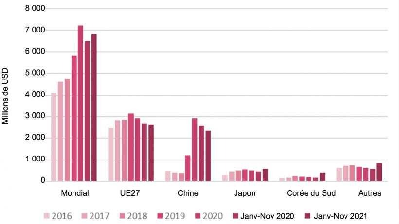 L'Espagne est un grand exportateur de viande de porc et exporte plus de la moitié de la production nationale. En ce qui concerne 2021, de janvier à novembre, les exportations ont augmenté de 5 % par rapport à la même période en 2020. Cela s'explique par la croissance de la demande dans l'Union européenne et en Chine, principale destination du porc espagnol, notamment au cours du premier semestre 2021. Cependant, de juillet à novembre 2021, les exportations de porc espagnol vers la Chine ont chuté de 42 %, en raison d'une baisse de la demande de viande de porc dans ce pays. Les autres marchés asiatiques, l'Amérique du Nord et le Chili se sont maintenus en 2021 mais n'ont pas compensé les pertes dues à la baisse de la demande en Chine en juillet 2021.