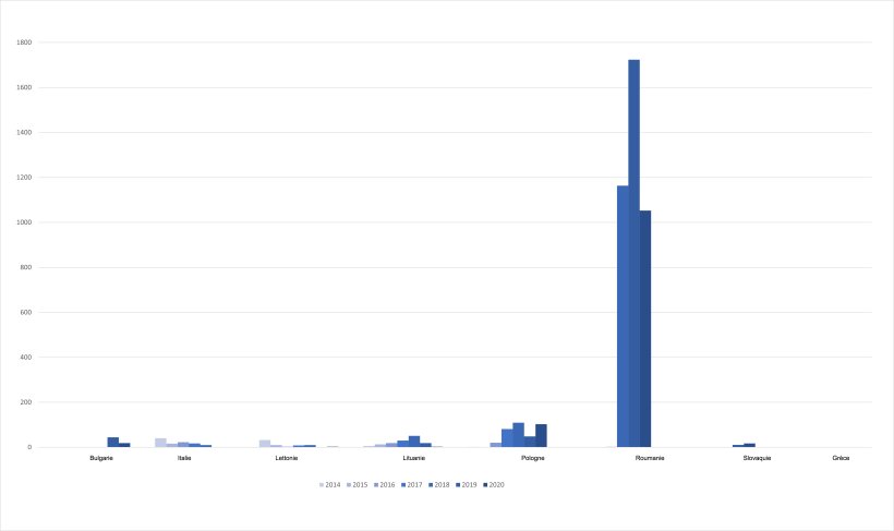 Si le nombre de foyers chez les porcs domestiques en 2020 (1.199 foyers) a diminué par rapport à 2019 (1.848) et 2018 (1.344), il convient de noter l'augmentation significative du nombre de foyers en Pologne (103), qui avait réussi à diminuer en 2019 (48 foyers). La Roumanie reste en tête de la liste des pays ayant de loin le plus grand nombre de foyers chez les porcs domestiques, avec 1.053 foyers confirmés.