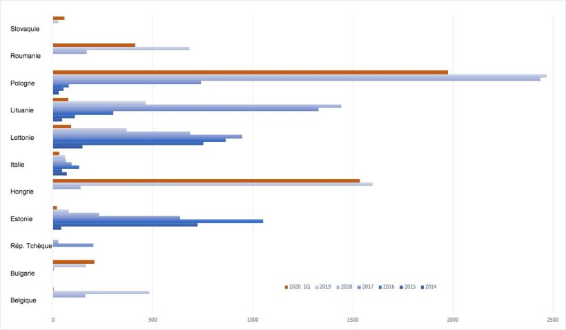 La situation s'est aggravée en Pologne, à la fois dans le rebond du nombre de cas chez les sangliers et dans la localisation des foyers, en l'occurrence pour les porcs domestiques et les sangliers. En ce qui concerne les foyers chez les sangliers, une nette augmentation est observée, avec 1.976 foyers déjà confirmés à ce jour cette année (2.468 foyers en 2019) et un bond géographique important amorcé fin 2019 vers l'ouest du pays et qui a continué à progresser, avec de nombreux foyers chez des sangliers à quelques kilomètres seulement de la frontière allemande. Bien que seuls deux foyers aient été détectés en élevages au cours de ce premier trimestre, ils ont été localisés dans cette nouvelle zone à l'ouest du pays, le premier dans une exploitation commerciale comptant plus de 23.000 animaux et le second étant un foyer secondaire lié au premier.