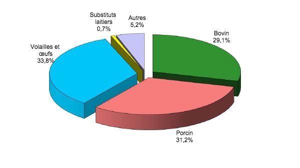 Le marché des aliments pour animaux dépend du marché des produits de l'élevage. En 2018, le cheptel de l'UE-28 a produit 52,8 millions de tonnes de viande (dont 7,9 millions de tonnes de veau, 23,8 millions de tonnes de porc et 15,6 millions de tonnes de viande de volaille) ainsi que 172 millions de tonnes de lait et 6,9 millions de tonnes d’œufs.