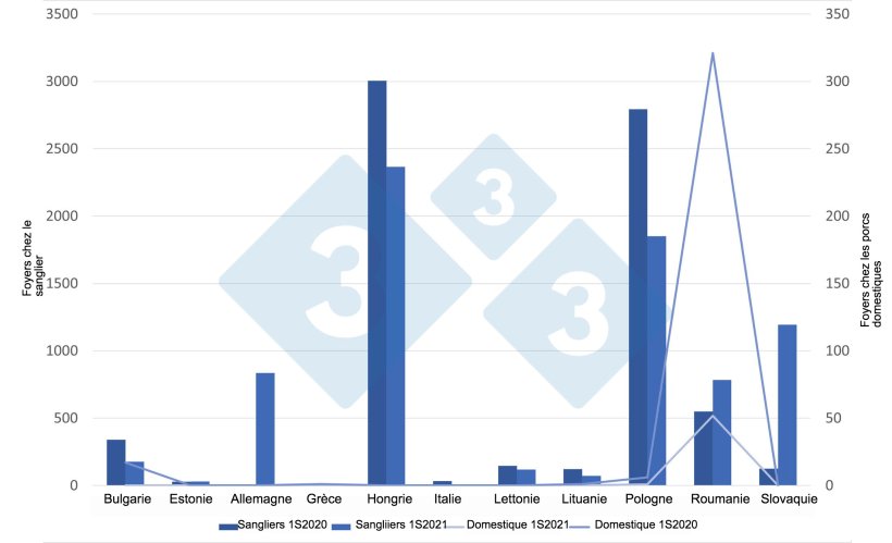 Selon les données du premier semestre de cette année fournies par le système de notification des maladies animales (ADNS-ADIS) de l'Union européenne, le nombre de foyers de peste porcine africaine (PPA) chez les sangliers a atteint 7.429, soit un peu plus qu'à la même période de 2020, où 7.144 foyers ont été signalés, tandis que chez les porcs domestiques, ils ont flambé (346 foyers au premier semestre de 2020 et 526 au premier semestre de cette année).