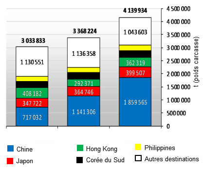 La Chine est clairement en tête des destinations, avec 44,9% de la part totale (1.859.565 t, +63% en comparaison avec 2015), suivie, de loin, par le Japon avec 9,7% (399.507 t), Hong Kong avec 8,8% (362.319 t), la Corée du Sud avec 6,3% (259.244 t) et les Philippines avec 5,2% (215.696 t).