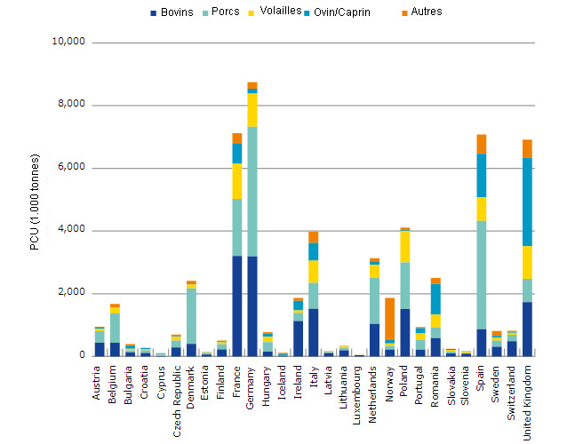 En général, porcs, bovins, volailles et ovins/caprins ont représenté respectivement 33% (19.593), 32% (18.855), 14% (8.050) et 13% (7.801), de PCU dans les 29 pays.