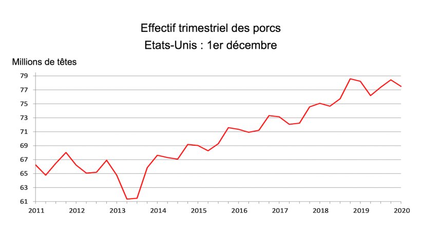 Au 1er décembre 2020, les effectifs américains de tous les porcs étaient de 77,5 millions de têtes, soit une baisse de 1% par rapport à l'année dernière au 1er décembre 2019 et une baisse de 1% par rapport au 1er septembre 2020.